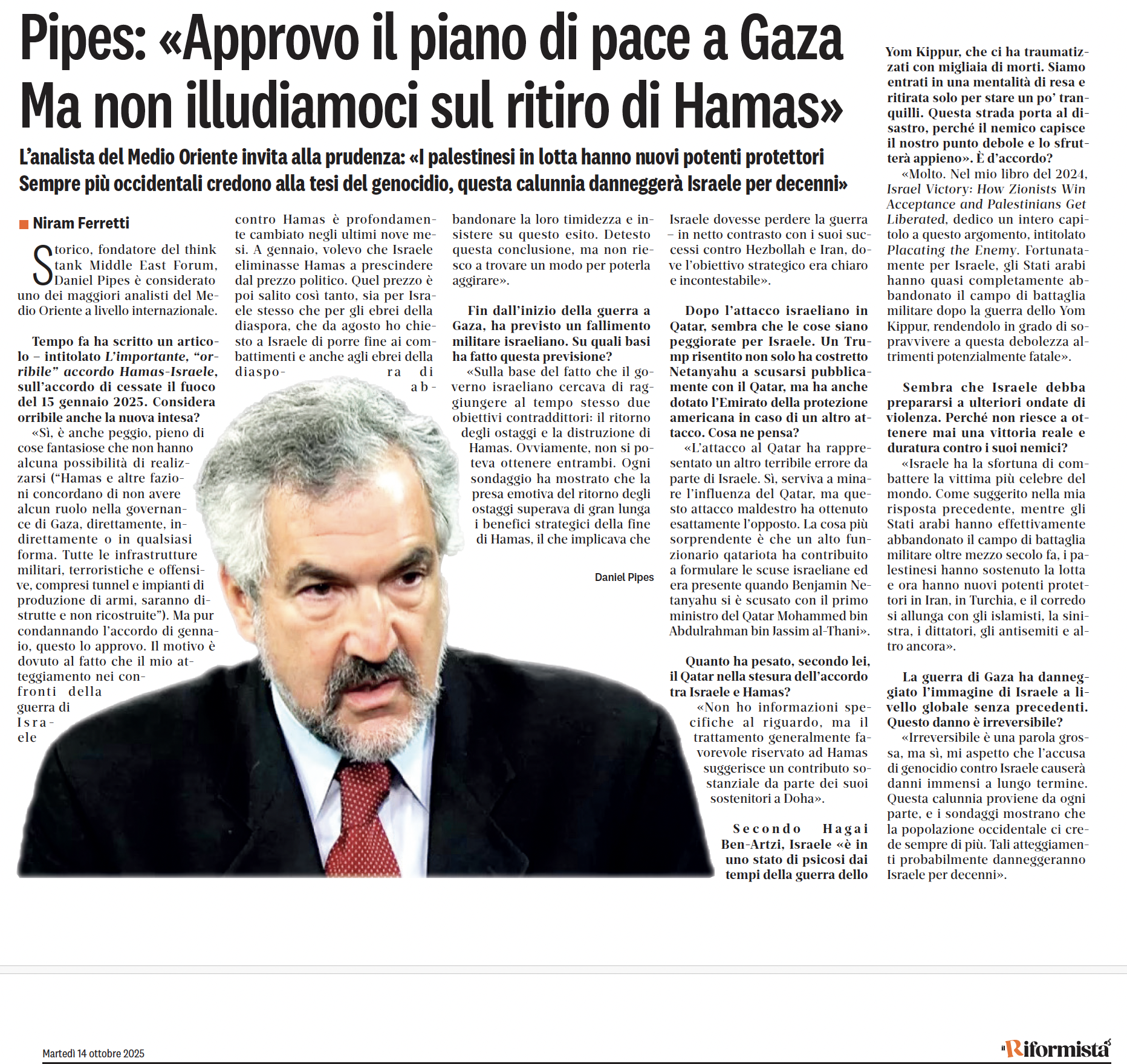 Daniel Pipes: Ya, perjanjian yang baru ini bahkan jauh lebih buruk lagi. Penuh dengan khayalan. Nol besar kemungkinannya untuk terwujud (soalnya, "Hamas dan faksi-faksi lain sepakat untuk tidak berperan apa pun dalam Pemerintahan Gaza. Baik langsung, tidak langsung, maupun dalam bentuk apa pun. Semua infrastruktur militer, teror, dan ofensif, termasuk terowongan dan fasilitas produksi senjata, akan dihancurkan dan tidak akan dibangun kembali").